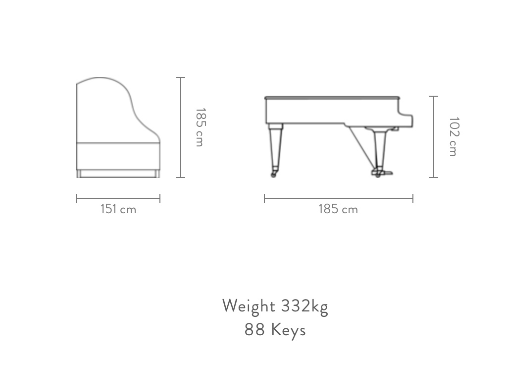 The latest Bösendorfer Grand Piano 185, while retaining the wonderful tradition of a brilliant and warm sound, features new and highly precise mechanics that guarantee perfect control and attainment of a huge range of dynamics and colors. For an instrument of this size, the volume of the bass and the capacity for finest nuances are spectacular. This piano, on account of its strong and stable mechanics, can be a wonderful practice instrument for the home, but equally a great concert instrument for a small hall. Let your heart be inspired by this piano.