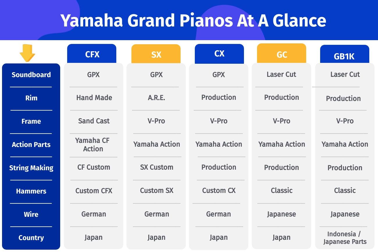 Yamaha manufactures a broad selection of piano models ranging from the CFX full-sized concert grand piano that is intended for large concert halls and other venues to smaller-sized models more suited to amateur pianists (See below).
